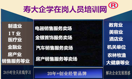 1、寿大企学商学院,哪里有公司员工培训的在线学习网温馨提示:本网课程适合,中小企业、初创公司,以及经营数年的制造业/销售/服务业(卖场)/娱乐业/技术服务类等行业,课程无行业分类,但拥有职位分类,所以可根据您的职位、目前的需求阶段,【如:我是公司经营者、或者管理层,直接选择,公司千万业绩课程】进行学习。